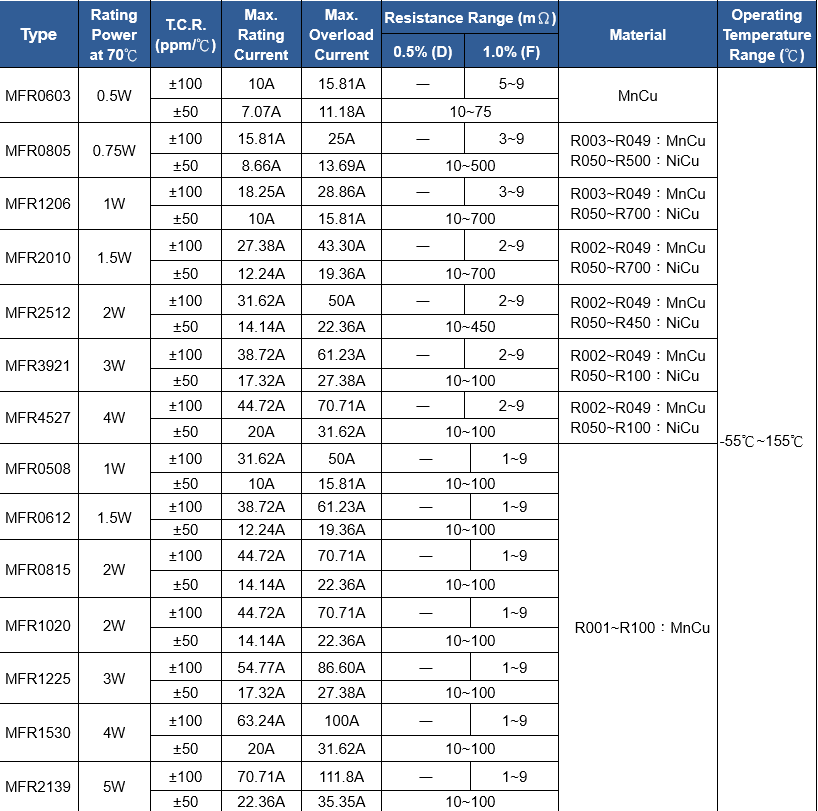 - 阻值范圍: 10mR~700mR