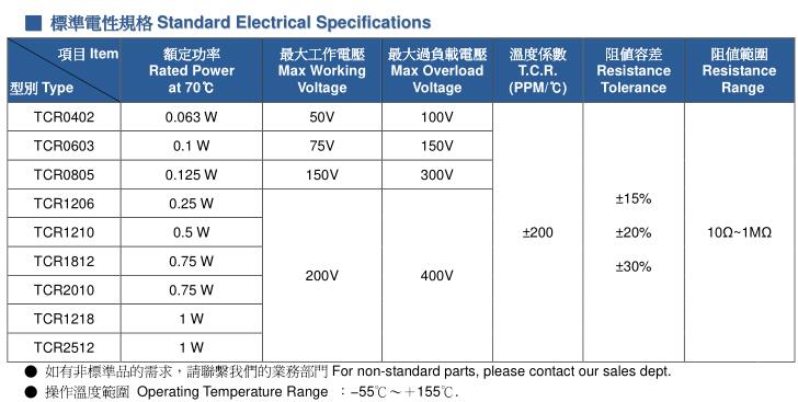 - 功率、封裝: 0402/0.063W 0603/0.1W 0805/0.125W 1206/0.25W 1210/0.5W 1812/0.5W 2010/0.75W 2512/1W 1218/ 1W